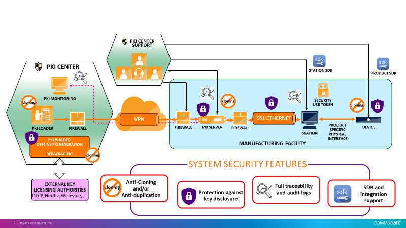 The CommScope product and information security team has unique experience in this domain, with three decades of end-to-end cryptographic identity provisioning experience in the field. Our supply-chain security framework includes extensive use of hardware security modules, cryptographic tokens, multiple layers of encryption, and end-to-end anti-cloning measures that extend to the entire global infrastructure.