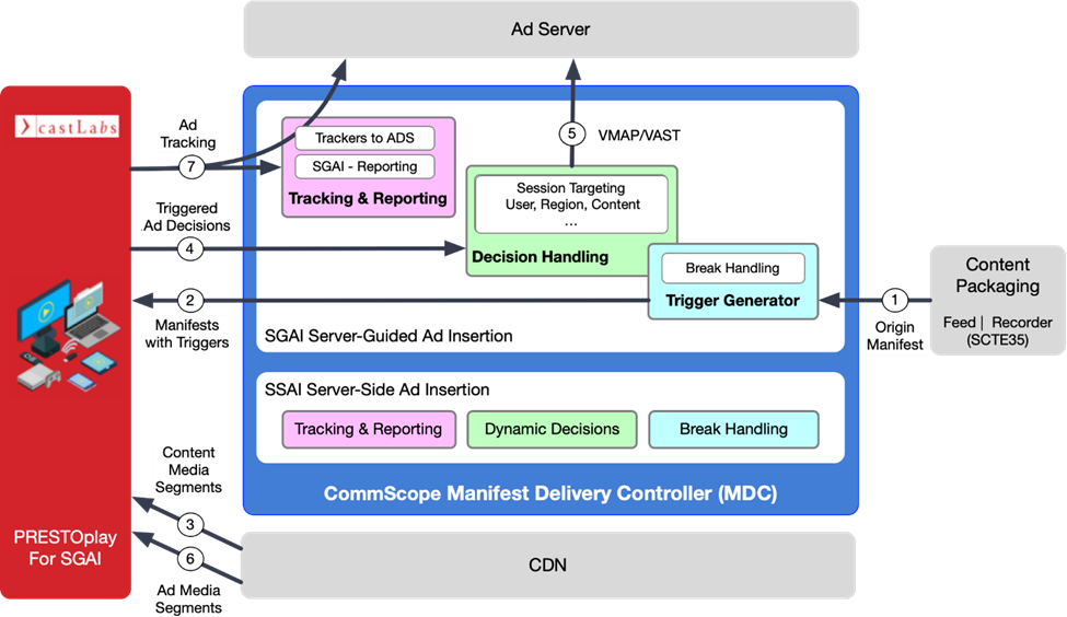 The Manifest Delivery Controller (MDC) from CommScope, combined with castLabs’ PRESTOplay for Addressable TV ads, demonstrate how server-guided ad insertion can help achieve greater ad delivery efficiency and increase ad revenue on compute-intensive time-shifted playback experiences.