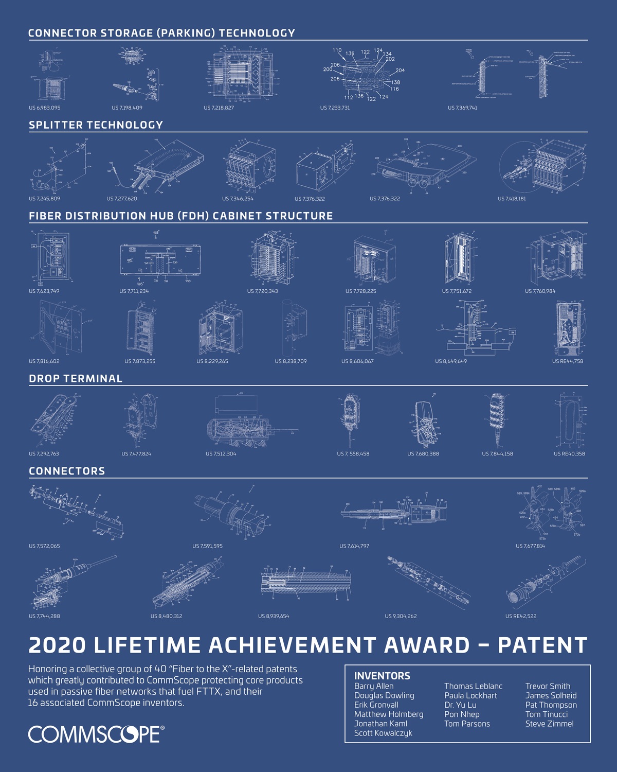 The CommScope 2020 Lifetime Achievement Award – Patent award honored a collective group of 40 fiber-to-the X patents that were issued early in the industry’s adoption of FTTX architectures. These patents relate to fiber connectivity products used in the passive fiber networks that enable FTTX in the areas of: