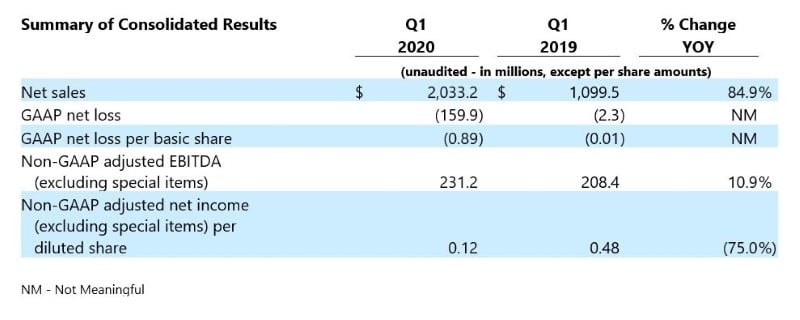 Non-GAAP adjusted EBITDA increased 10.9% to $231.2 million as compared to last year. On a combined company basis, non-GAAP adjusted EBITDA for the first quarter of 2020 decreased by 21.4% and was 11.4% of net sales compared to 11.9% of net sales in the first quarter of 2019. The company estimates that first-quarter 2020 non-GAAP adjusted EBITDA was negatively impacted by approximately $30 million related to supply chain disruptions as a result of COVID-19, as well as certain other COVID-19 related disruptions.