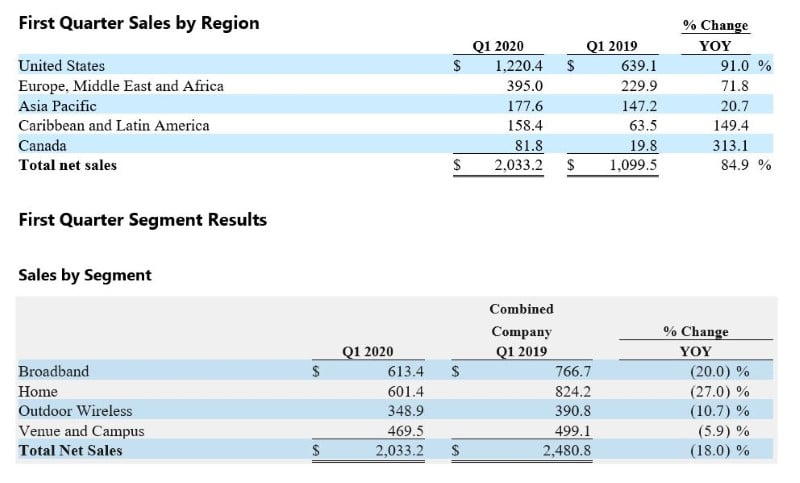 Net sales in the first quarter of 2020 increased 84.9% year over year to $2.03 billion primarily due to the contribution of $1.03 billion from the ARRIS acquisition. On a combined company basis, net sales decreased 18.0% year over year to $2.03 billion. The company estimates that first-quarter 2020 net sales were negatively impacted by approximately $70 million related to supply chain disruptions as a result of COVID-19, as well as certain other COVID-19 related disruptions.
