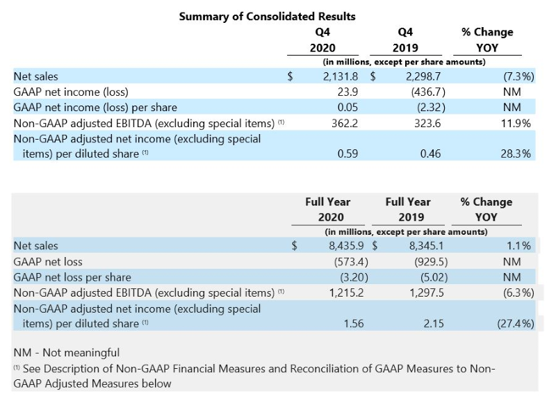 Non-GAAP adjusted EBITDA decreased 6.3% to $1,215.2 million compared to the prior year. On a combined company basis, non-GAAP adjusted EBITDA decreased 11.2% and represented 14.4% of net sales compared to 14.0% of net sales in 2019. The Company estimates that 2020 non-GAAP adjusted EBITDA was negatively impacted by approximately $70 million related to COVID-19 supply chain disruptions and certain other incremental costs.