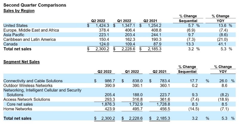 Net sales in the second quarter of 2022 increased 5.3% year-over-year to $2.30 billion. Core net sales increased 8.5% year-over-year primarily due to higher net sales in the Connectivity and Cable Solutions and Outdoor Wireless Networks segments.