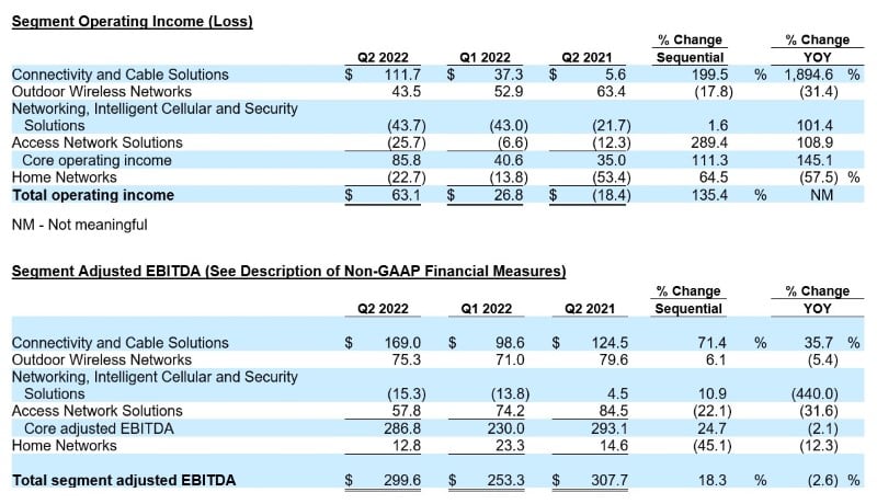 (1) “Core” financial measures reflect the results of the Connectivity and Cable Solutions; Outdoor Wireless Networks; Networking, Intelligent Cellular and Security Solutions; and Access Network Solutions segments, in the aggregate. Core financial measures exclude the results of the Home Networks segment. See the second quarter segment comparison tables below showing the aggregation of the Core financial measures.