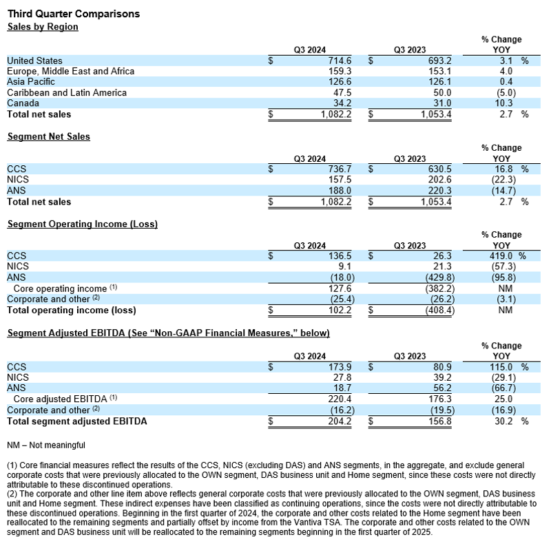 Net sales in the third quarter of 2024 increased 2.7% year-over-year to $1.082 billion due to stronger net sales in the CCS segment, partially offset by lower net sales in the NICS and ANS segments. Net sales increased across all regions, except the Caribbean and Latin America region, in the third quarter of 2024.